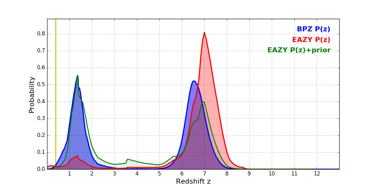 In P(z) plots: Yellow lines mark the cluster redshift z = 0.383,