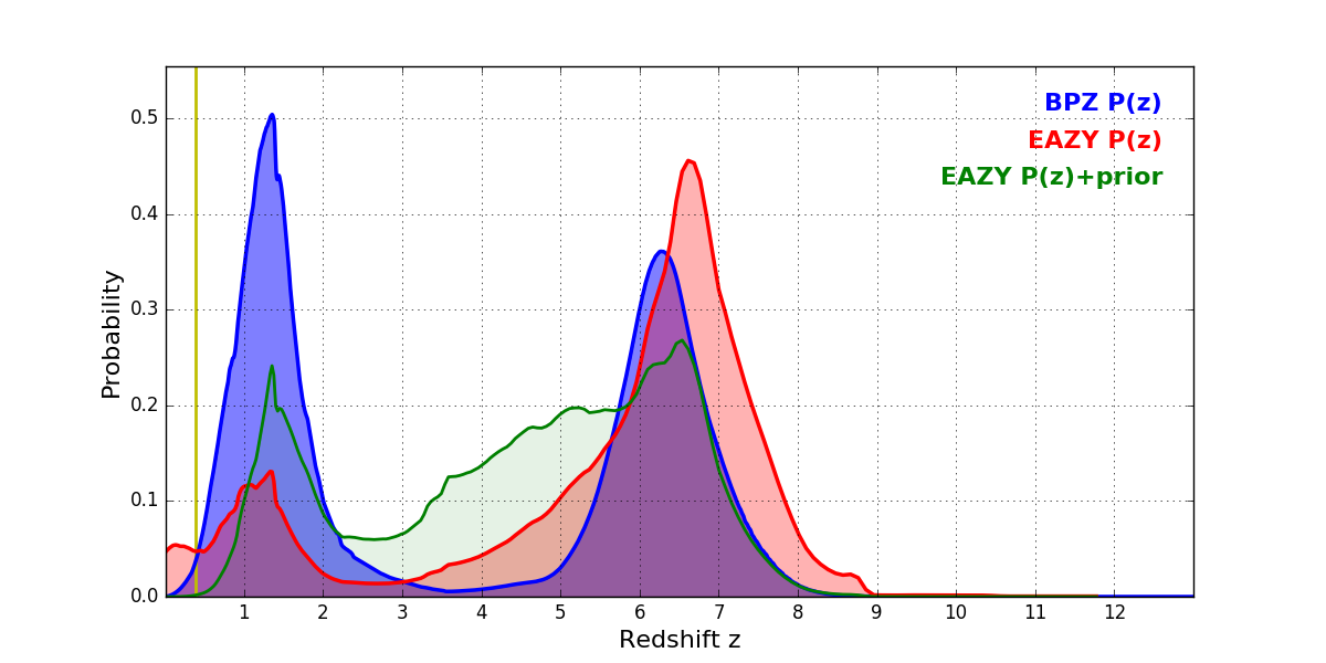 In P(z) plots: Yellow lines mark the cluster redshift z = 0.383,