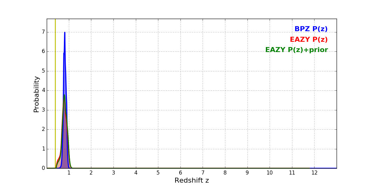 In P(z) plots: Yellow lines mark the cluster redshift z = 0.383,
