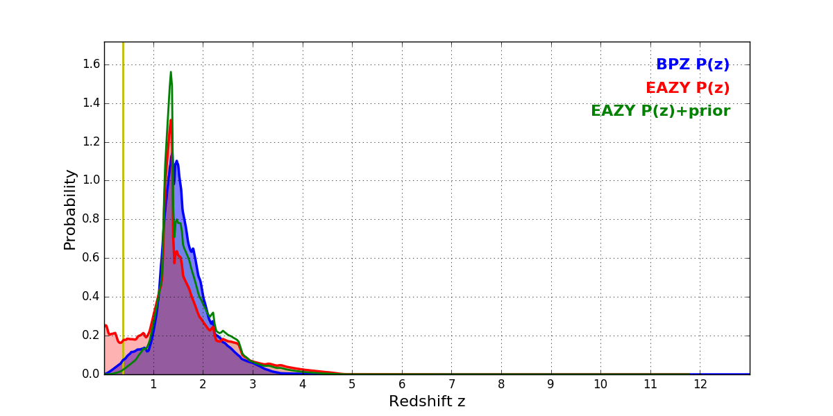 In P(z) plots: Yellow lines mark the cluster redshift z = 0.383,