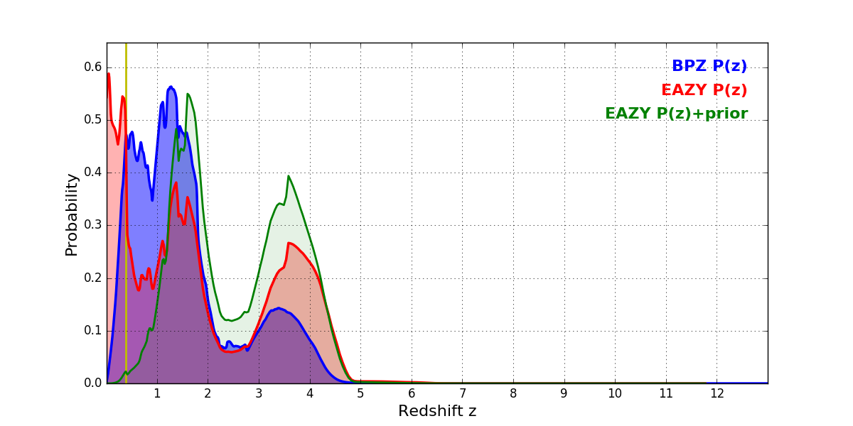 In P(z) plots: Yellow lines mark the cluster redshift z = 0.383,