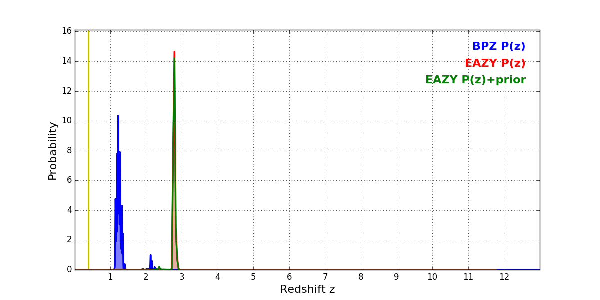 In P(z) plots: Yellow lines mark the cluster redshift z = 0.383,