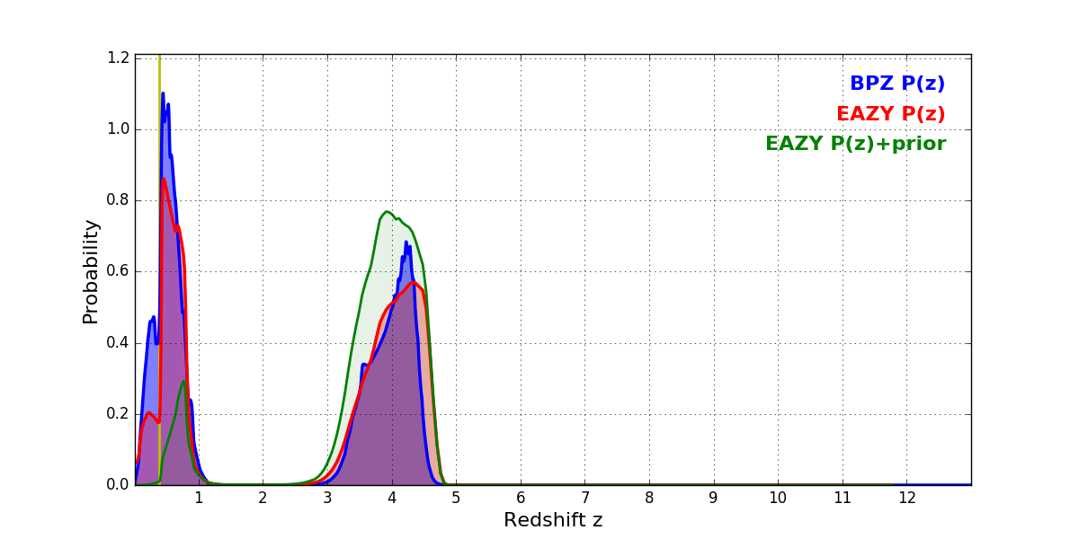 In P(z) plots: Yellow lines mark the cluster redshift z = 0.383,