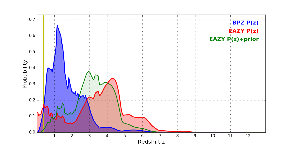 In P(z) plots: Yellow lines mark the cluster redshift z = 0.383,