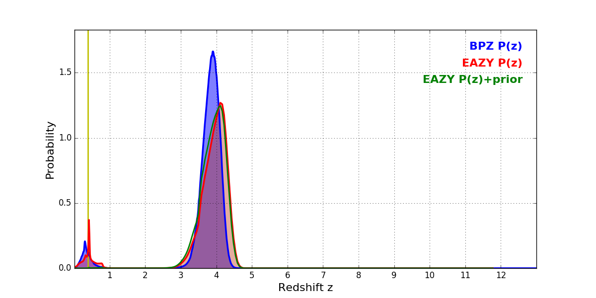 In P(z) plots: Yellow lines mark the cluster redshift z = 0.383,