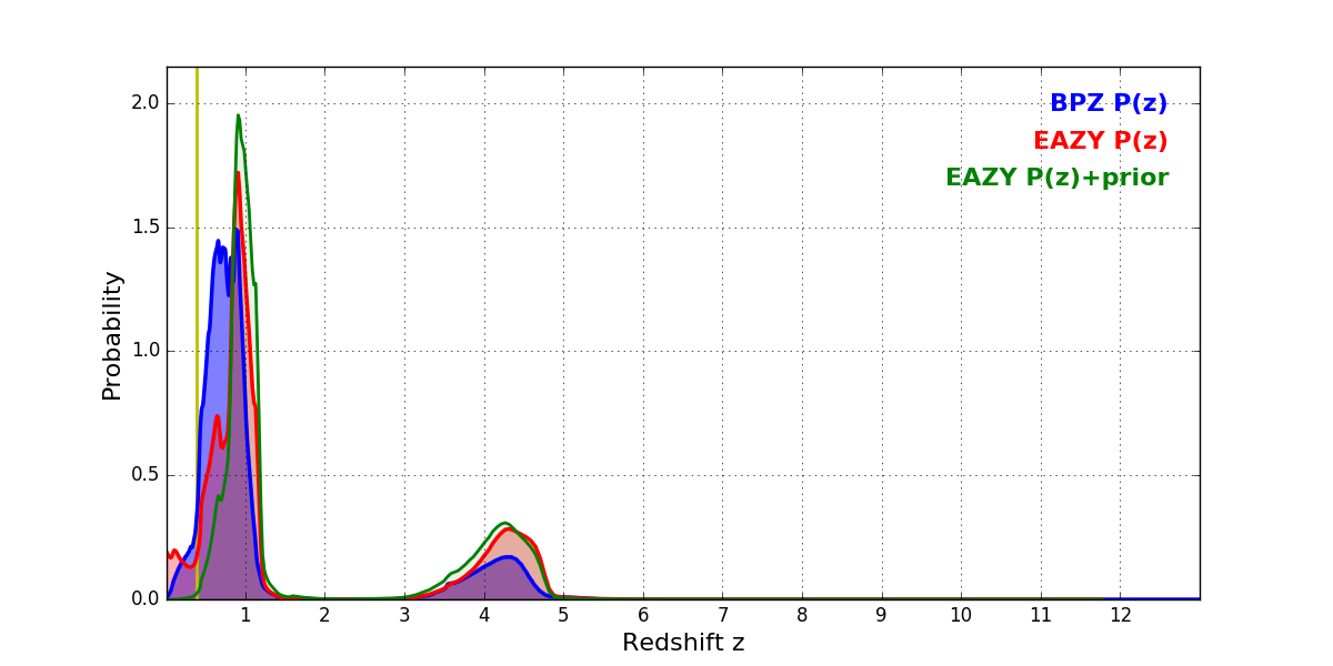 In P(z) plots: Yellow lines mark the cluster redshift z = 0.383,