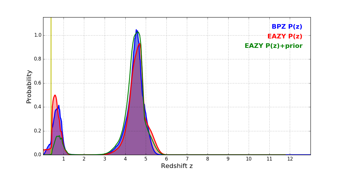 In P(z) plots: Yellow lines mark the cluster redshift z = 0.383,