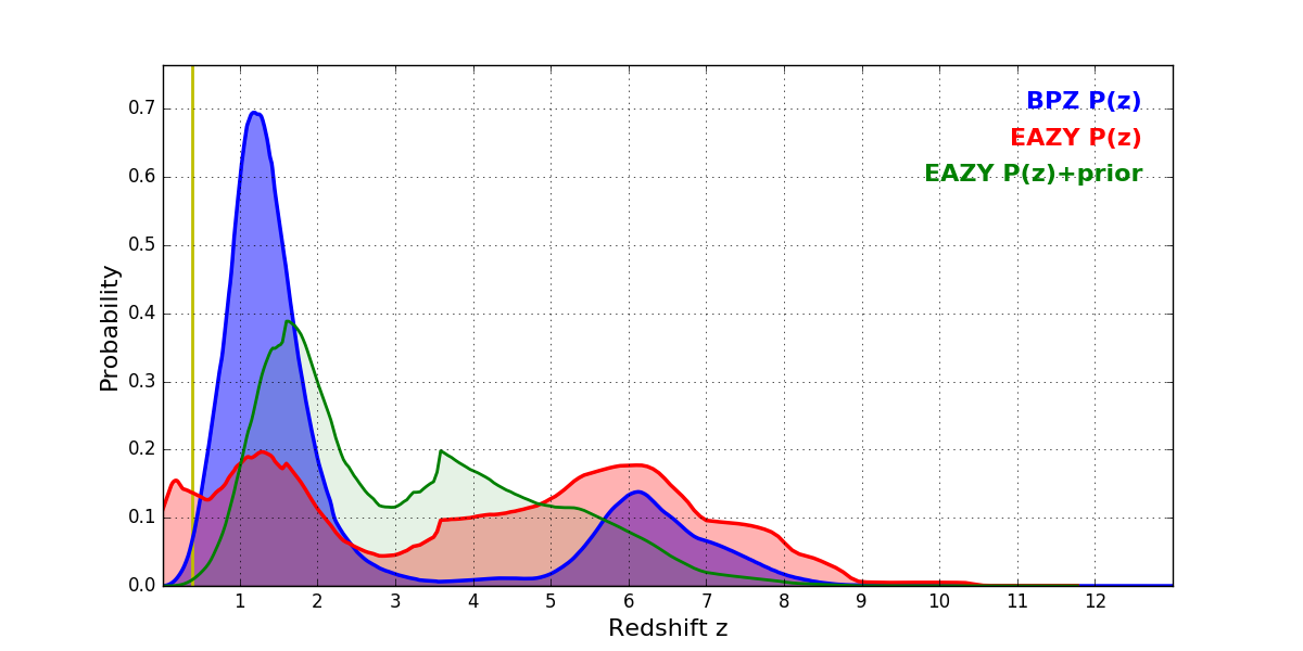 In P(z) plots: Yellow lines mark the cluster redshift z = 0.383,