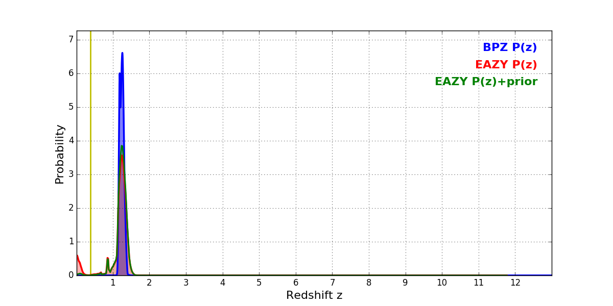 In P(z) plots: Yellow lines mark the cluster redshift z = 0.383,