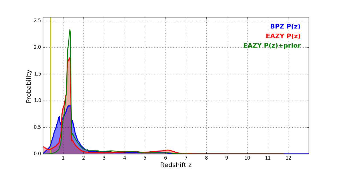 In P(z) plots: Yellow lines mark the cluster redshift z = 0.383,