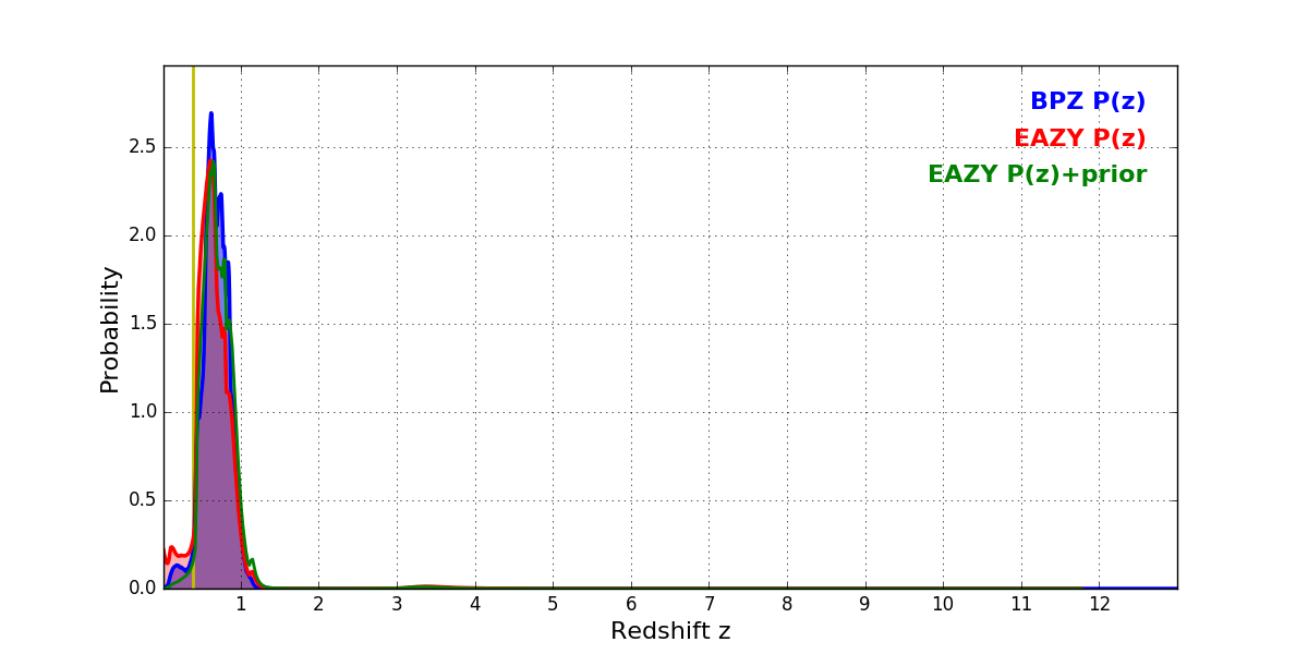 In P(z) plots: Yellow lines mark the cluster redshift z = 0.383,