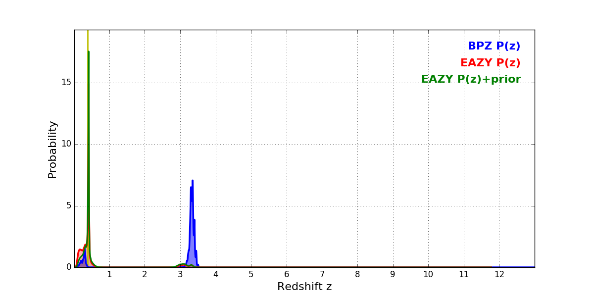 In P(z) plots: Yellow lines mark the cluster redshift z = 0.383,