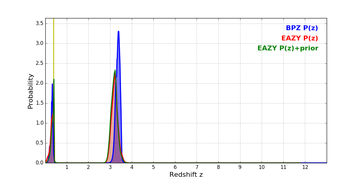 In P(z) plots: Yellow lines mark the cluster redshift z = 0.383,