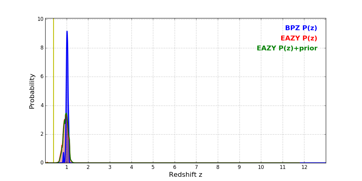 In P(z) plots: Yellow lines mark the cluster redshift z = 0.383,