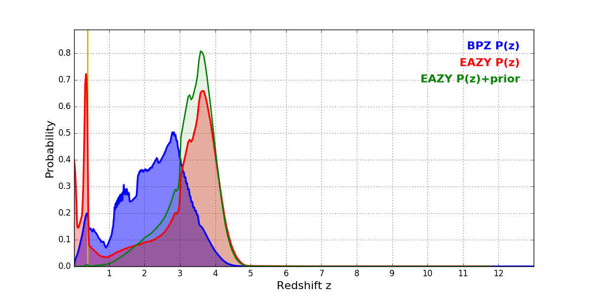 In P(z) plots: Yellow lines mark the cluster redshift z = 0.383,