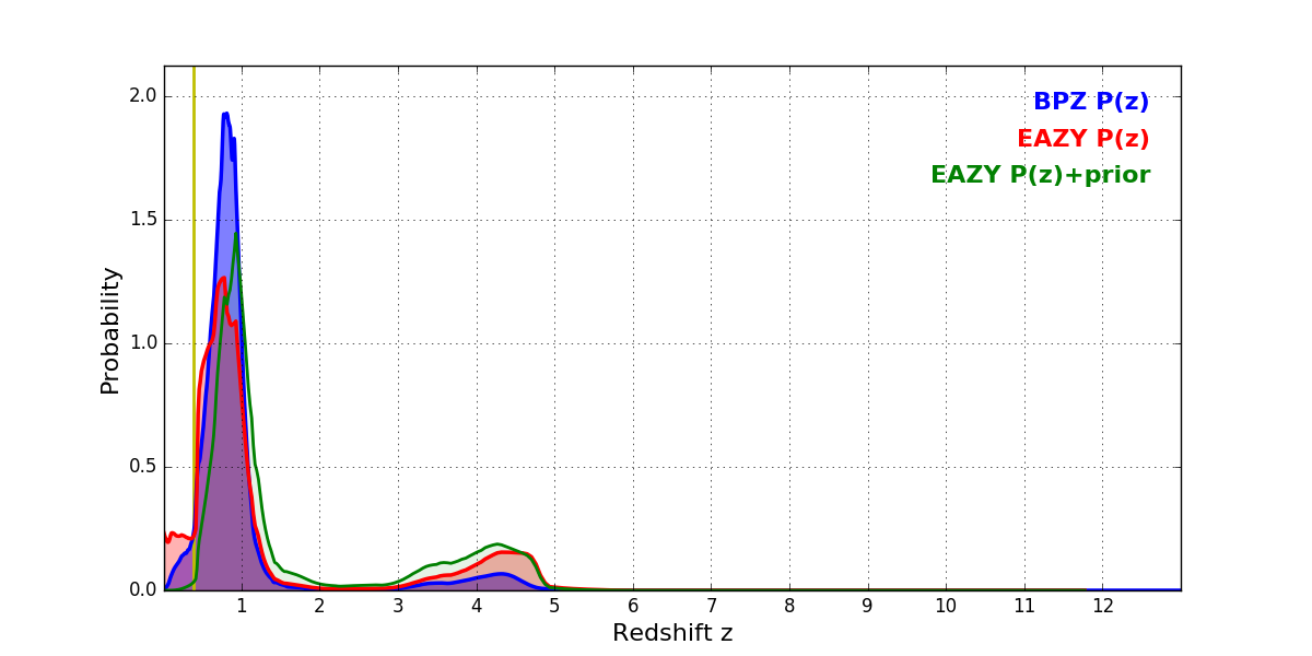 In P(z) plots: Yellow lines mark the cluster redshift z = 0.383,