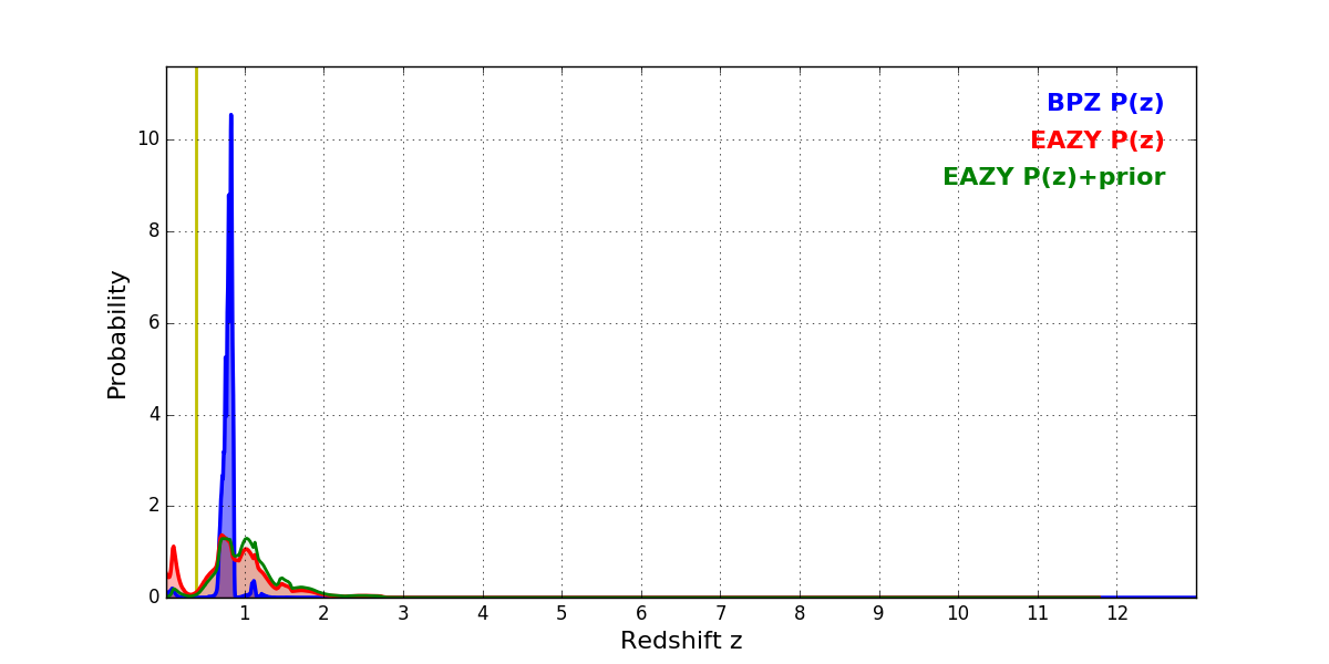 In P(z) plots: Yellow lines mark the cluster redshift z = 0.383,