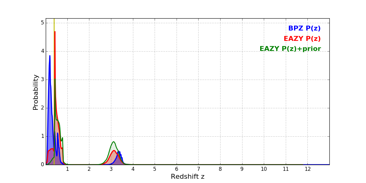 In P(z) plots: Yellow lines mark the cluster redshift z = 0.383,
