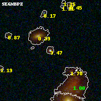 Object #205 x,y = (2325, 2918) RA, Dec = (09:49:53.520, 17:07:46.56) = (147.47300, 17.12960) BPZ = 3.470 [0.291--3.531] type = 9.20 (SB2_B10 - SB3_B10) chisq2 = 0.37 ODDS = 0.91 z_cluster = 0.383