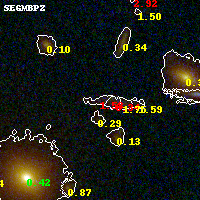 Object #242 x,y = (2640, 2847) RA, Dec = (09:49:52.200, 17:07:42.24) = (147.46750, 17.12840) BPZ = 1.580 [1.286--1.867] type = 9.20 (SB2_B10 - SB3_B10) chisq2 = 1.34 ODDS = 0.52 z_cluster = 0.383