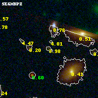 Object #36 x,y = (2900, 3422) RA, Dec = (09:49:51.120, 17:08:16.80) = (147.46300, 17.13800) BPZ = 3.983 [3.456--4.349] type = 9.20 (SB2_B10 - SB3_B10) chisq2 = 0.99 ODDS = 0.65 z_cluster = 0.383