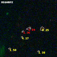 Object #46 x,y = (2122, 3390) RA, Dec = (09:49:54.360, 17:08:14.64) = (147.47650, 17.13740) BPZ = 1.341 [1.083--2.003] type = 8.80 (SB2_B10 - SB1_B10) chisq2 = 1.00 ODDS = 0.34 z_cluster = 0.383