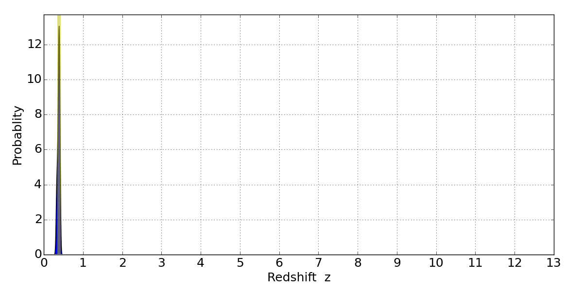 In P(z) plots: Yellow lines mark the cluster redshift z = 0.383,