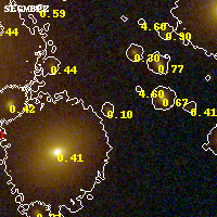 Object #585 x,y = (2895, 2211) RA, Dec = (09:49:51.120, 17:07:04.08) = (147.46300, 17.11780) BPZ = 0.103 [0.029--1.036] type = 4.00 (Ell4_A_0) chisq2 = 0.31 ODDS = 0.40 z_cluster = 0.383