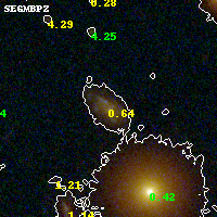 Object #632 x,y = (3374, 2118) RA, Dec = (09:49:49.128, 17:06:58.32) = (147.45470, 17.11620) BPZ = 0.641 [0.536--0.720] type = 7.90 (SB1_B10 - Scd_B10) chisq2 = 0.09 ODDS = 0.88 z_cluster = 0.383
