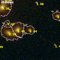 Object #738 x,y = (2864, 1949) RA, Dec = (09:49:51.264, 17:06:48.24) = (147.46360, 17.11340) BPZ = 0.441 [0.209--0.571] type = 6.40 (Sbc_B10 - Scd_B10) chisq2 = 0.06 ODDS = 0.55 z_cluster = 0.383
