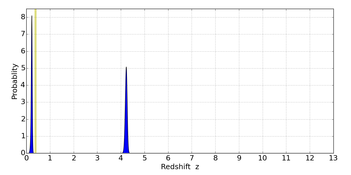 In P(z) plots: Yellow lines mark the cluster redshift z = 0.383,