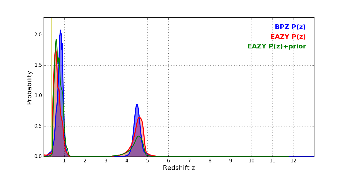 In P(z) plots: Yellow lines mark the cluster redshift z = 0.397,
