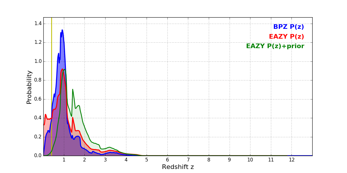 In P(z) plots: Yellow lines mark the cluster redshift z = 0.397,