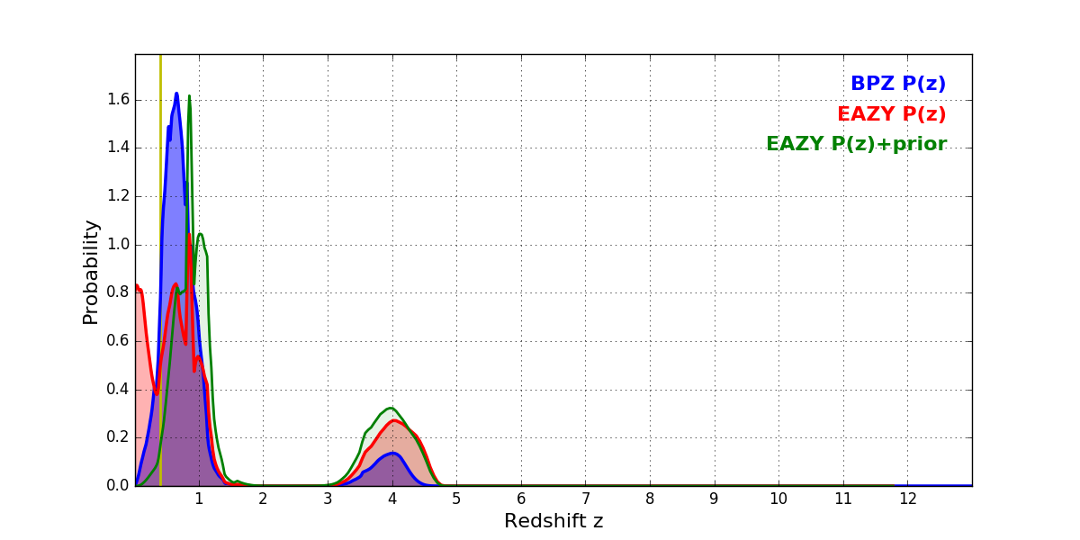 In P(z) plots: Yellow lines mark the cluster redshift z = 0.397,
