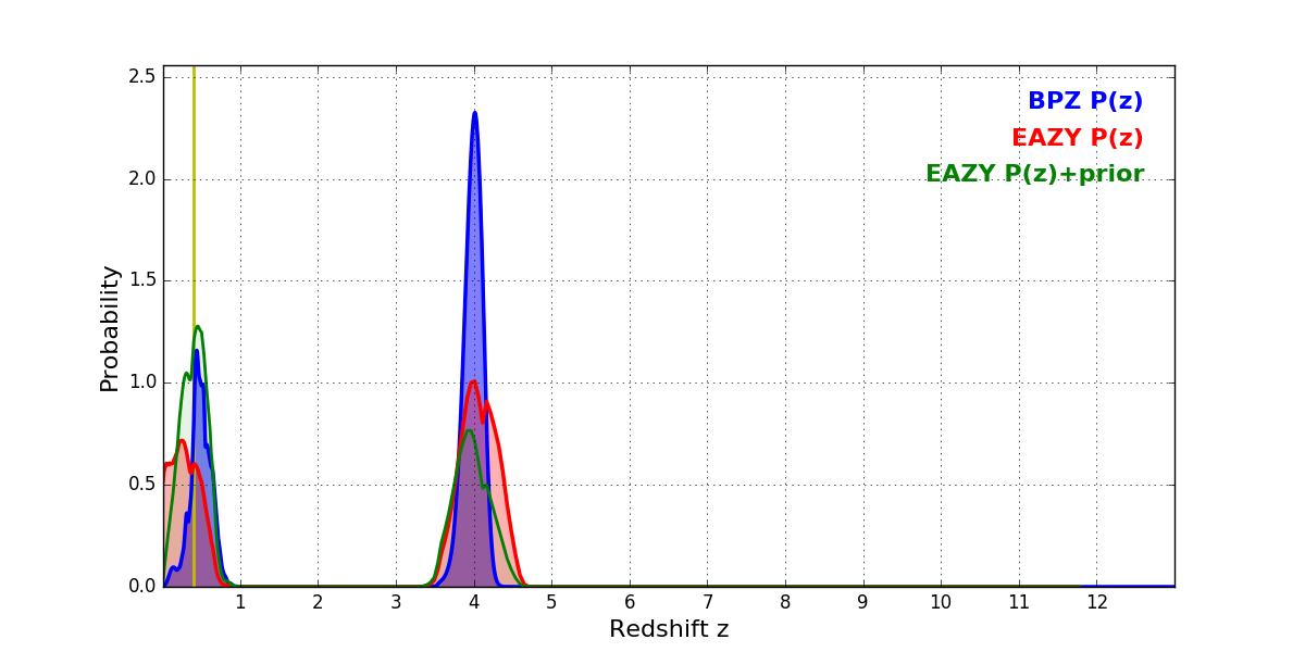 In P(z) plots: Yellow lines mark the cluster redshift z = 0.397,
