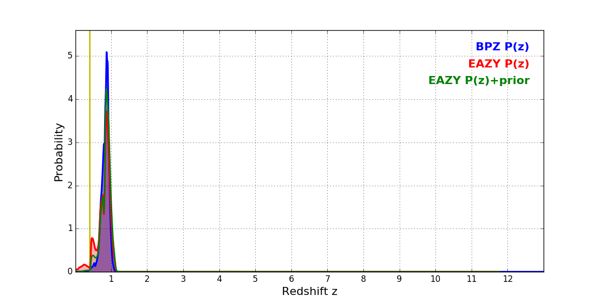 In P(z) plots: Yellow lines mark the cluster redshift z = 0.397,