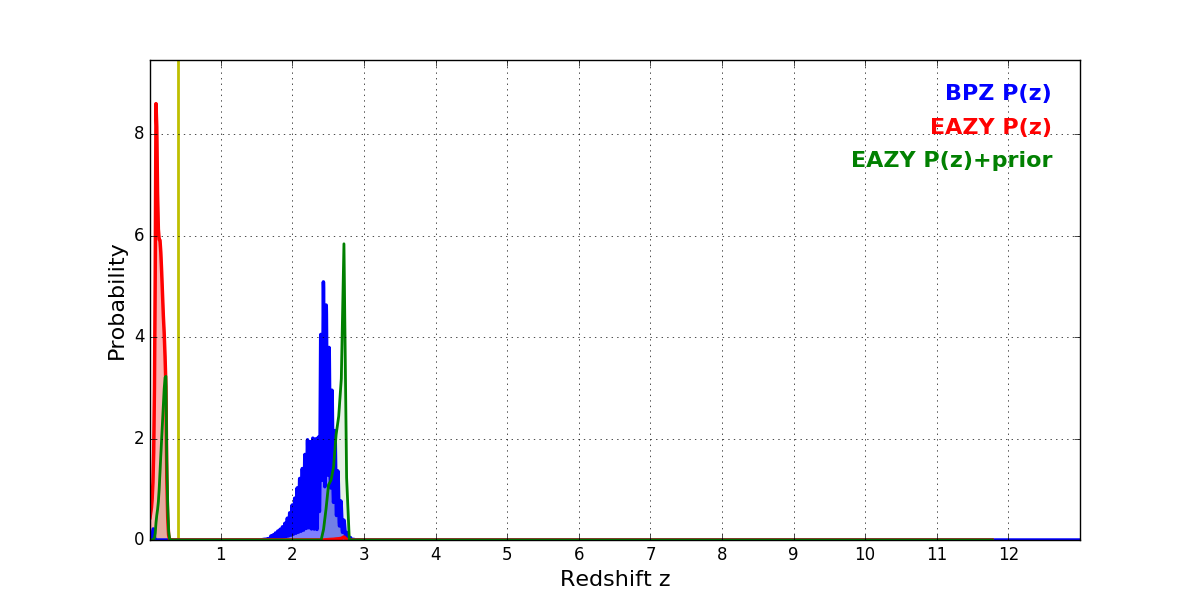 In P(z) plots: Yellow lines mark the cluster redshift z = 0.397,