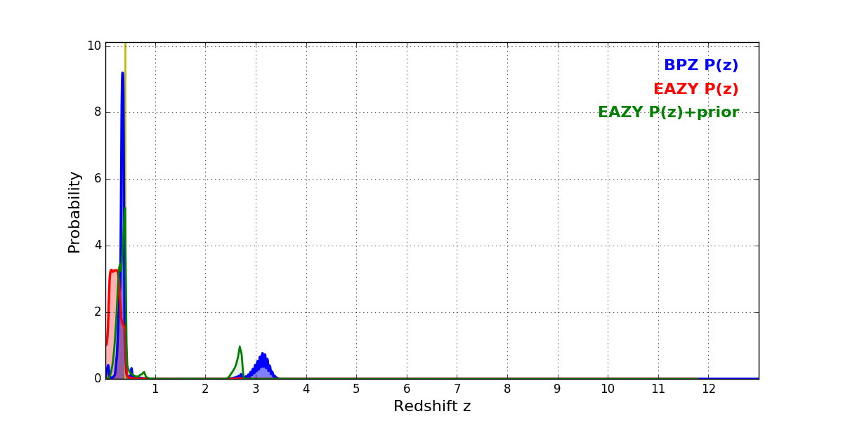 In P(z) plots: Yellow lines mark the cluster redshift z = 0.397,