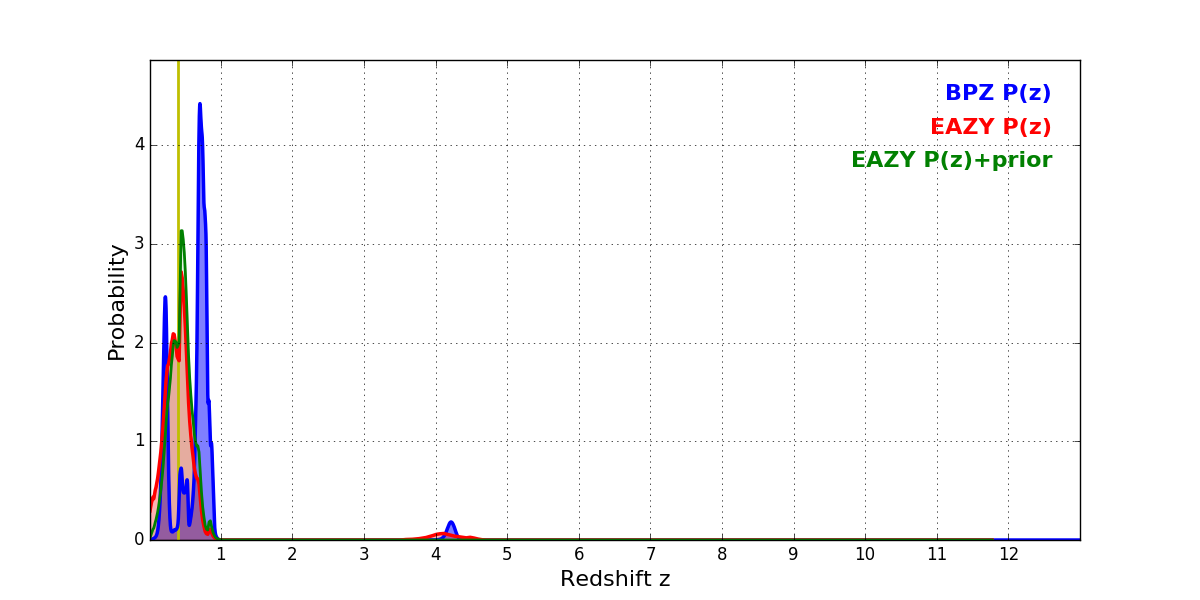 In P(z) plots: Yellow lines mark the cluster redshift z = 0.397,