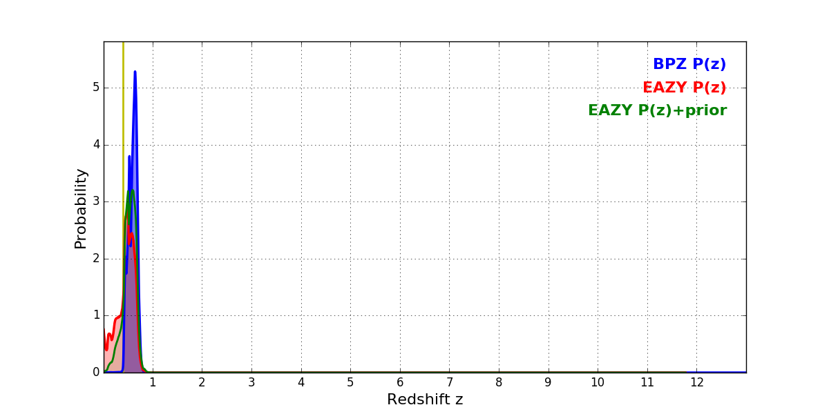 In P(z) plots: Yellow lines mark the cluster redshift z = 0.397,