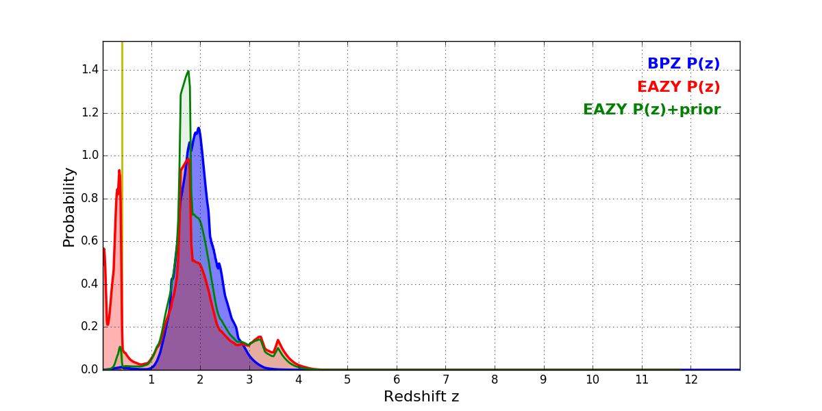 In P(z) plots: Yellow lines mark the cluster redshift z = 0.397,