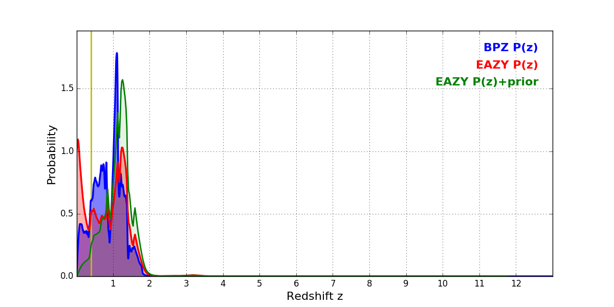 In P(z) plots: Yellow lines mark the cluster redshift z = 0.397,