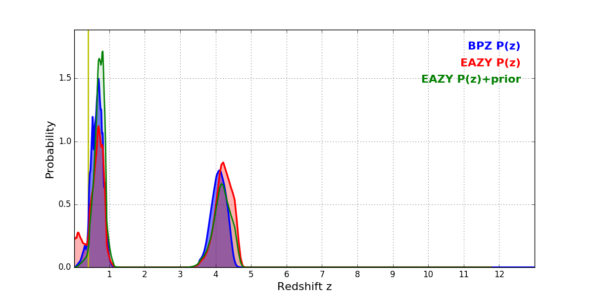 In P(z) plots: Yellow lines mark the cluster redshift z = 0.397,