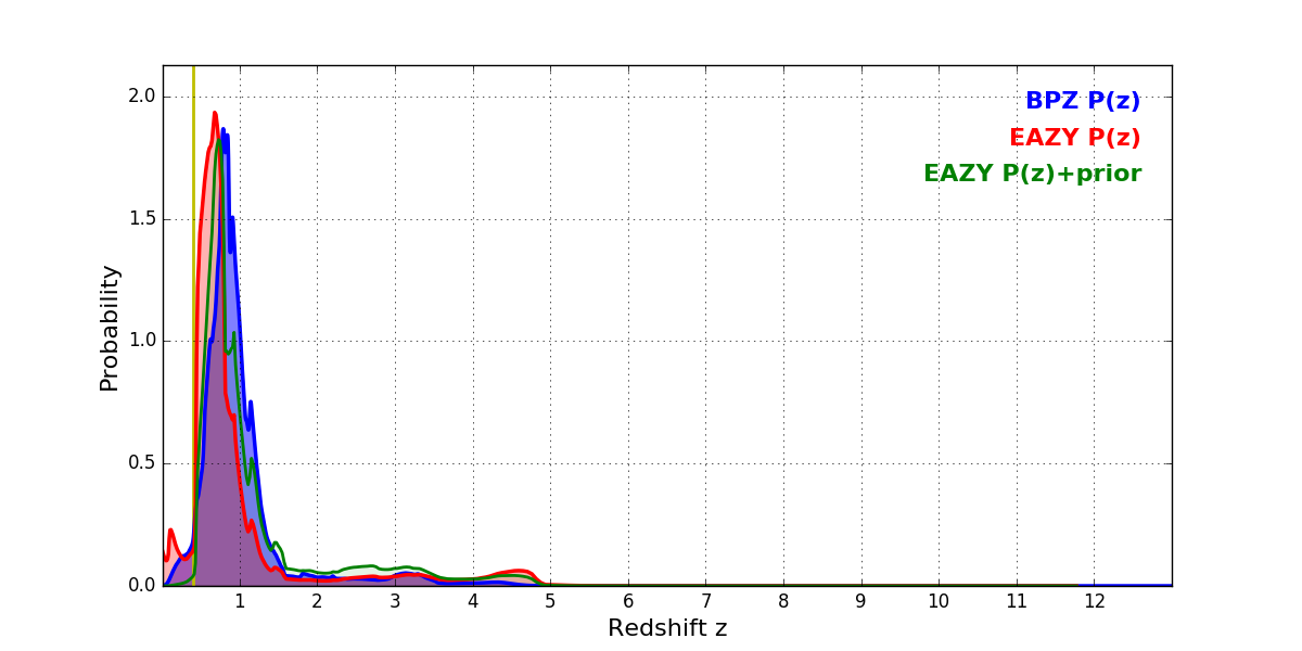 In P(z) plots: Yellow lines mark the cluster redshift z = 0.397,