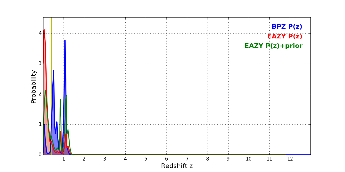 In P(z) plots: Yellow lines mark the cluster redshift z = 0.397,