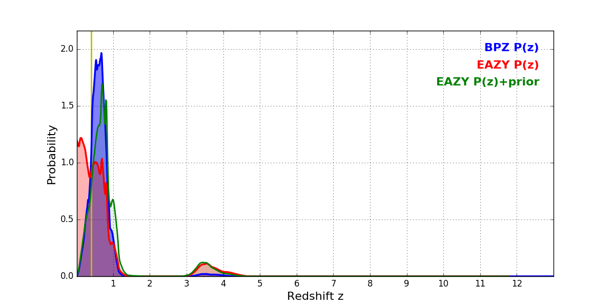 In P(z) plots: Yellow lines mark the cluster redshift z = 0.397,