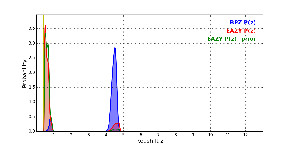 In P(z) plots: Yellow lines mark the cluster redshift z = 0.397,