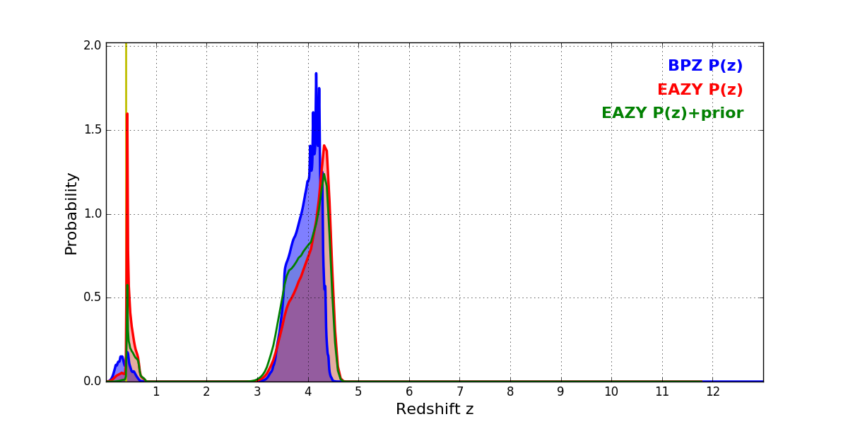 In P(z) plots: Yellow lines mark the cluster redshift z = 0.397,