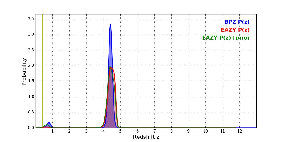 In P(z) plots: Yellow lines mark the cluster redshift z = 0.397,