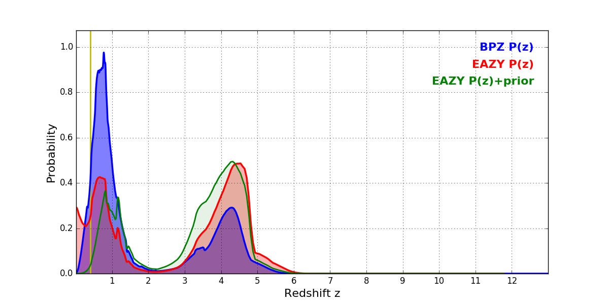 In P(z) plots: Yellow lines mark the cluster redshift z = 0.397,
